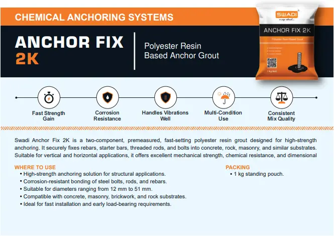 Swadi Anchor Fix 2K is a two-component, premeasured, fast-setting polyester resin grout designed for high-strength anchoring. It securely fixes rebars, starter bars, threaded rods, and bolts into concrete, rock, masonry, and similar substrates. Suitable for vertical and horizontal applications, it offers excellent mechanical strength, chemical resistance, and dimensional