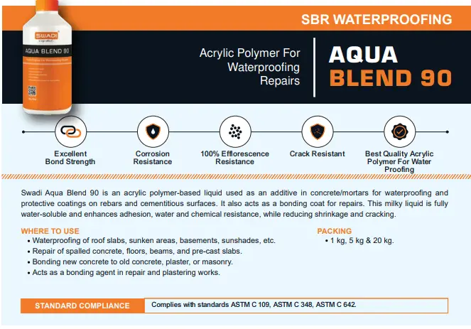 Swadi Aqua Blend 90 is an acrylic polymer-based liquid used as an additive in concrete/mortars for waterproofing and protective coatings on rebars and cementitious surfaces. It also acts as a bonding coat for repairs. This milky liquid is fully water-soluble and enhances adhesion, water and chemical resistance, while reducing shrinkage and cracking.