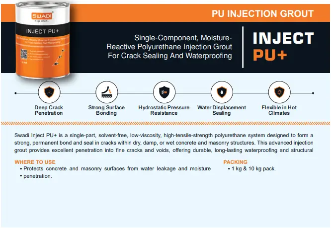 Swadi Inject PU+ is a single-part, solvent-free, low-viscosity, high-tensile-strength polyurethane system designed to form a strong, permanent bond and seal in cracks within dry, damp, or wet concrete and masonry structures. This advanced injection grout provides excellent penetration into fine cracks and voids, offering durable, long-lasting waterproofing and structural